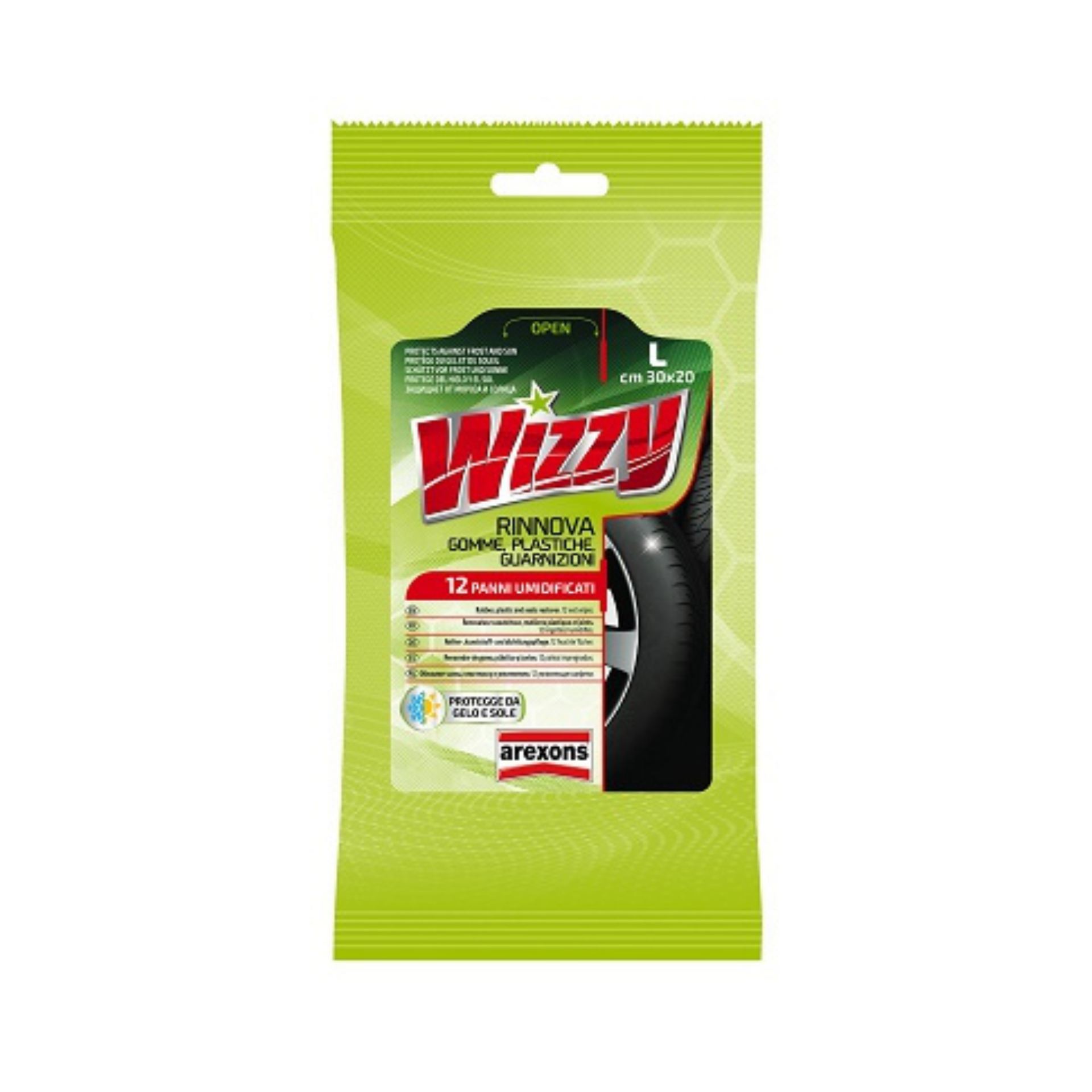 Wizzy renueva las partes de caucho, plástico y juntas; es un producto eficaz y muy rápido de usar para dar brillo a los neumáticos. Aporta un aspecto nuevo después del lavado del automóvil. Además, es muy útil para renovar todas las partes de plástico externas de la carrocería. Es la solución para la decoloración de parachoques, molduras o marcos de las ventanillas. Utilizado sobre las juntas de caucho, protege, renueva y evita la adhesión (por hielo o radiación solar); se recomienda por lo tanto para puertas, maleteros, ventanillas o techos solares. Ideal para tratar y nutrir capotas de PVC.